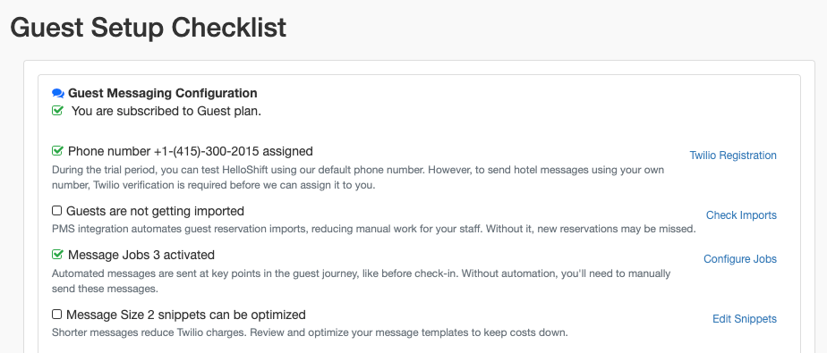 Make sure you’re using everything included in your plan. The new setup checklist walks you through key steps—like assigning your phone number, importing guests, and activating automated messages—so your team gets the full value right away.