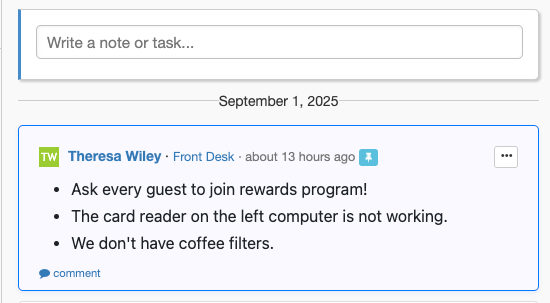Always on Top: Pinned notes and tasks won’t get buried, keeping urgent reminders—like upsell goals or equipment issues—front and center.